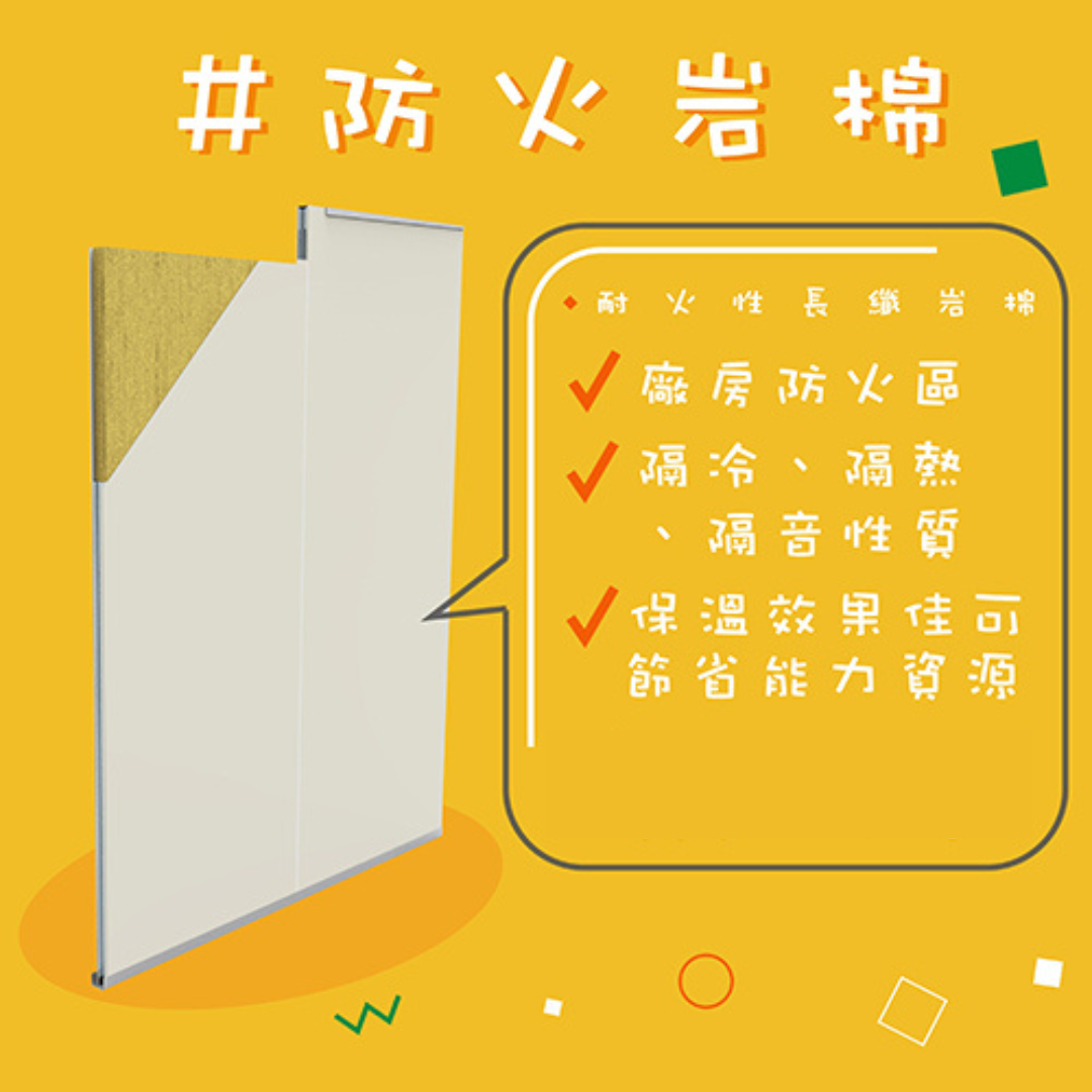 材質特色為防火、保溫 和吸音, 而我司岩棉庫板 具有防火1小時 的功效, 所以多運用於: 廠房防火區劃、公共安全區塊、消防法規規定之防火區域 等……,若您有防火規劃需求, 請選擇岩棉!