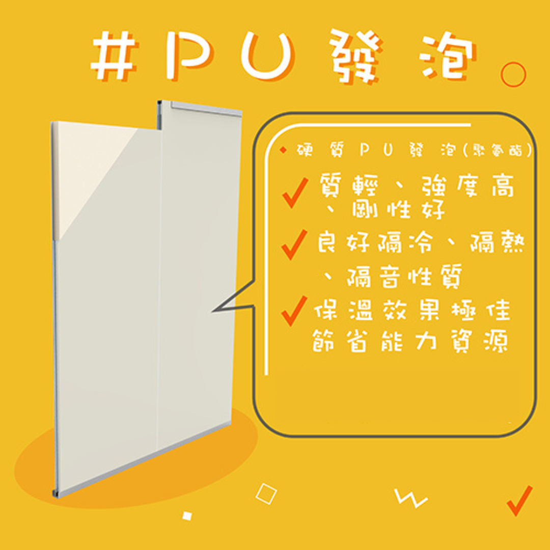 2.PU(聚氨酯): 因製作方式為直接發泡成型, 所以材質特色為不易受潮, 多運用於須保持乾燥之場所,